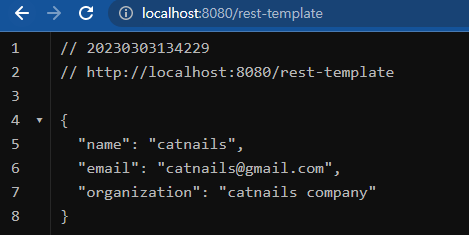 localhost:9090 => CrudController.getName() => return new MemberDto("catnails", "catnails@gmail.com", "catnails company"); //객체 json 반환 |