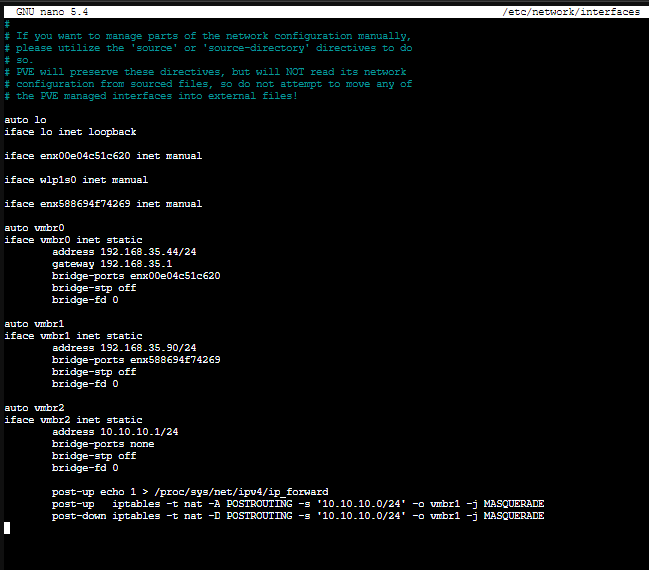 post-down iptables -t nat -D POSTROUTING -s '10.10.10.0/24' -o vmbr1 -j MASQUERADE