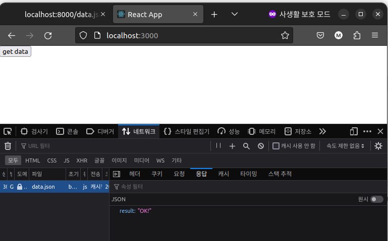 확실히 확인하기 위해 fetch('http://localhost:8000/data.json') 행을 지운 경우에도 잘 동작하였다.