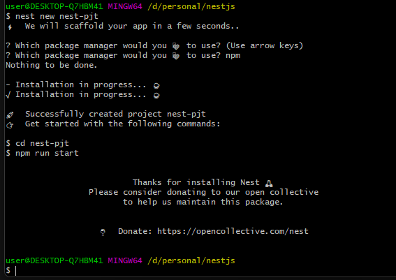 user@DESKTOP-Q7HBM41 MINGW64 /d/personal/nestjs/nest-pjt (master)