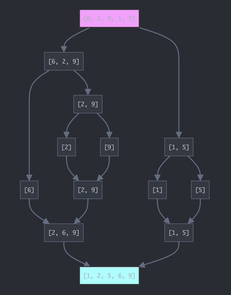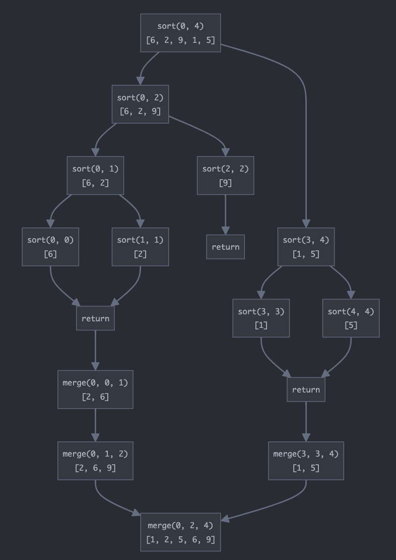 - 2단계: 자른 순서의 역순으로 한 쌍씩 값을 비교하여 합쳐간다.
