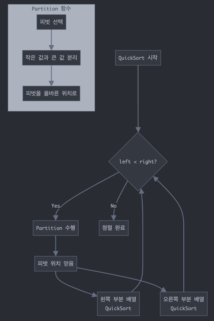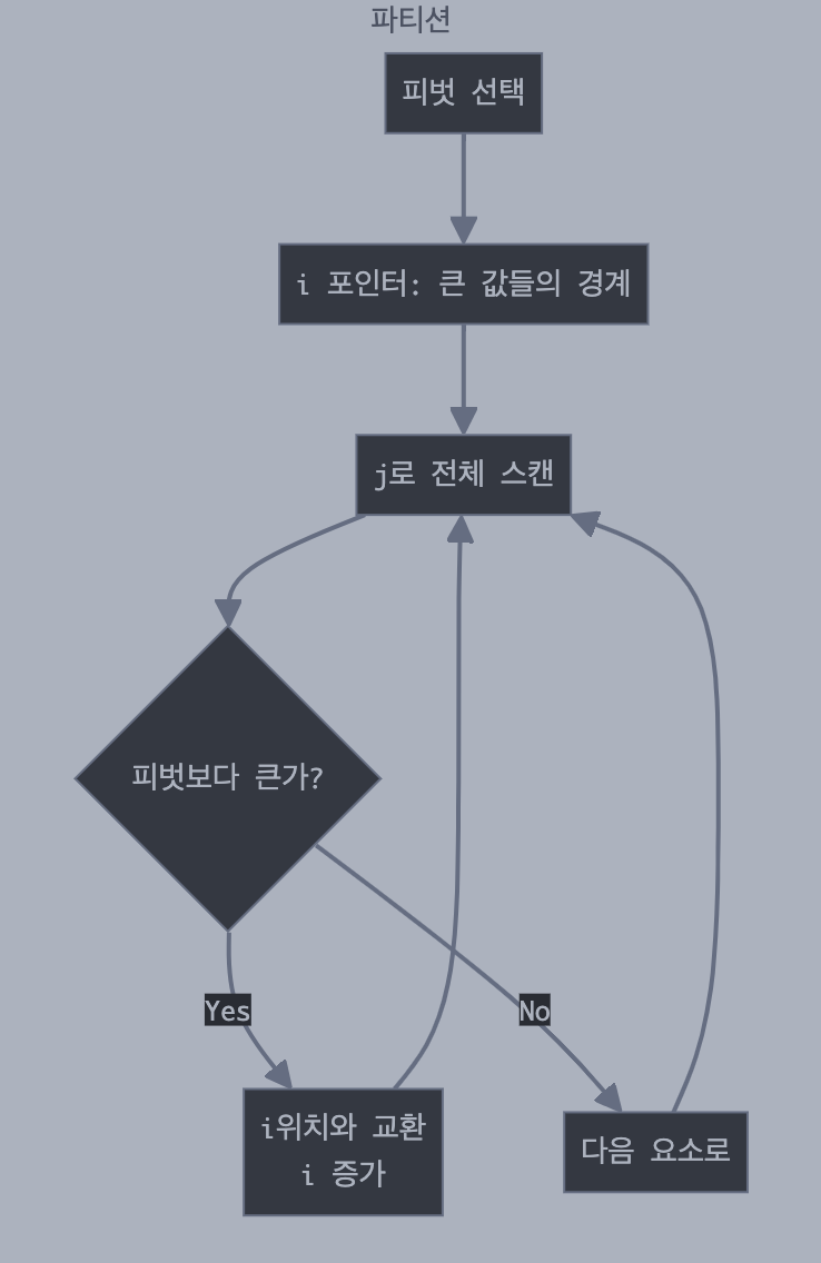- 2단계: 피벗 앞에는 피벗보다 작은 값의 원소를 두고, 피벗 뒤에는 값이 큰 원소들이 오도록 배열을 '분할'한다. 분할 후 피벗의 위치는 변경되지 않는다.