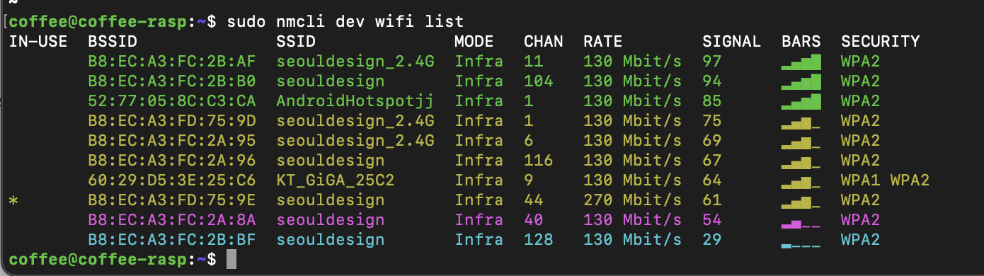 coffee@coffee-rasp:~$ sudo nmcli device wifi connect "seouldesign" password "P@ssW0rd"
