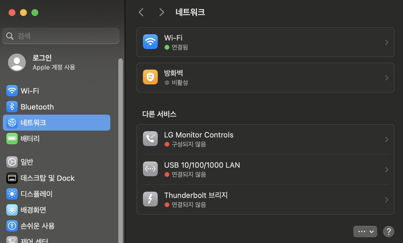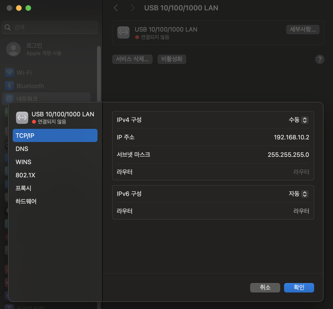 맥북과 직접 연결하기 위해서는 설정 - 네트워크 메뉴로 진입한 뒤, 이더넷(유선랜)을 사용하는 서비스의 설정을 변경해줘야 한다.