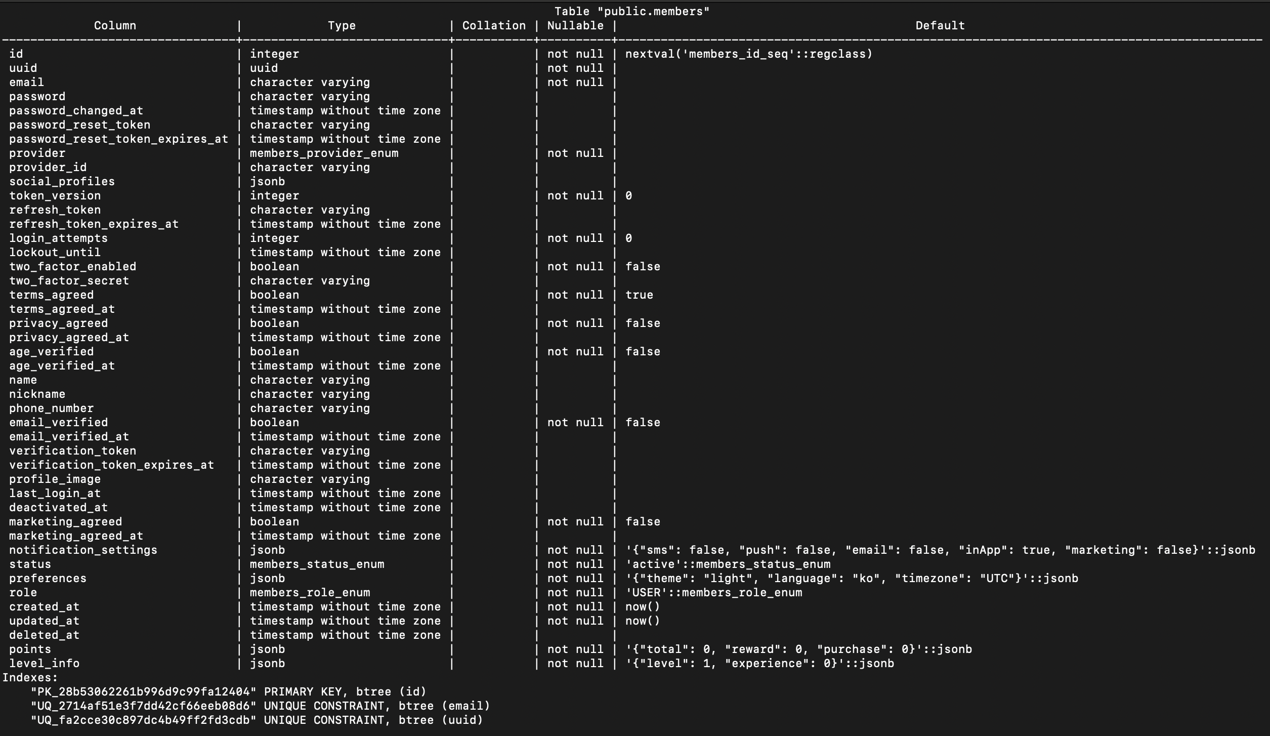 위처럼 스네이크 케이스 네이밍 전략이 사용된 테이블과 칼럼이 생성된다.