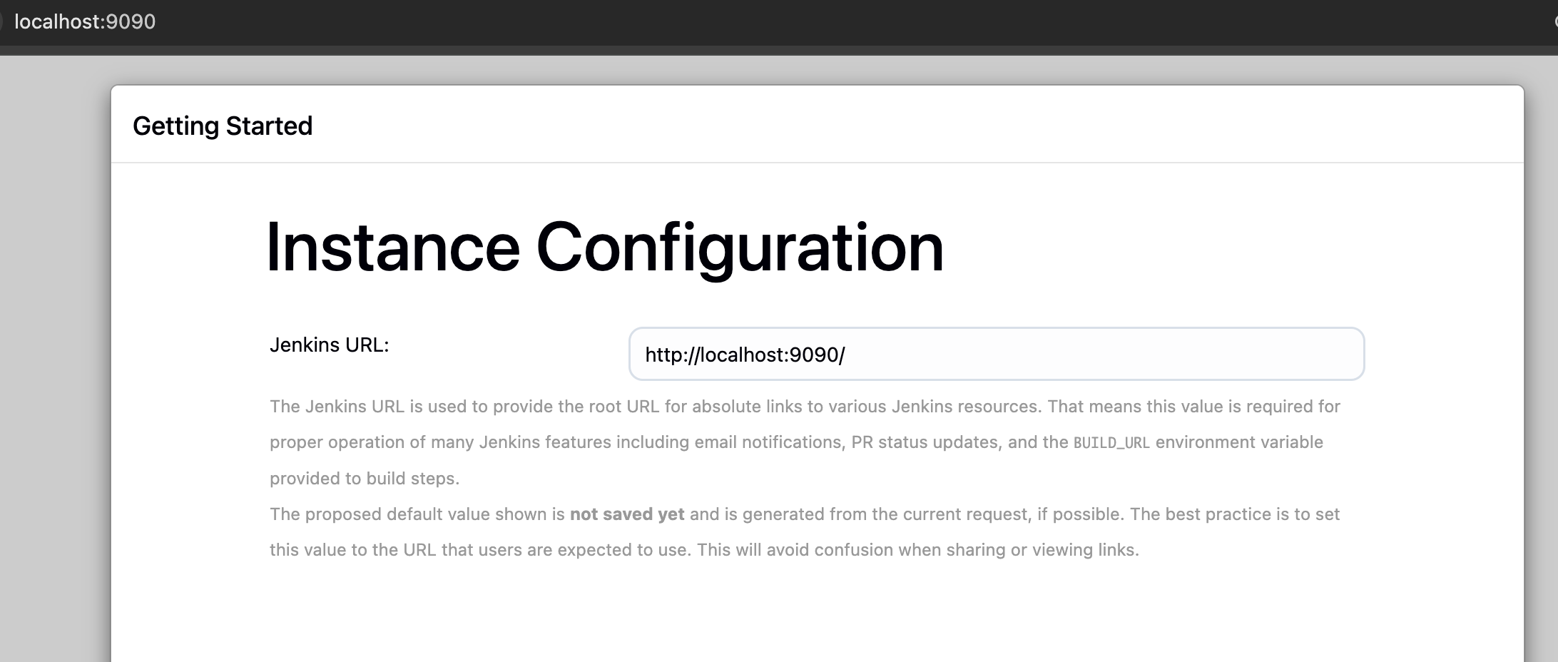 여기서 설정하는 "Jenkins URL"은 Jenkins가 외부 링크, 이메일 알림, PR 상태 업데이트 등을 생성할 때 사용된다. 현재 제안된 값은 http://localhost:9090/로 되어 있는데, 이는 현재 접속한 주소를 기반으로 자동 생성된 값이다.