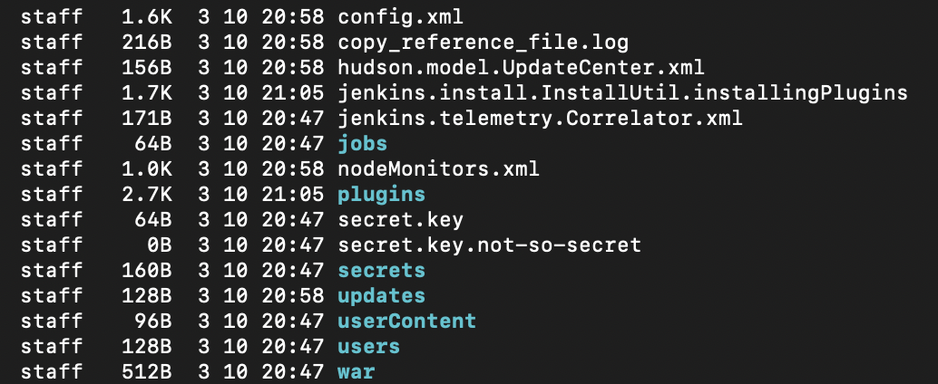 이 경우, 도커 컨테이너 내부의 /var/jenkins_home 디렉토리가 호스트(도커 컨테이너가 구동되는 머신)의 /Users/catnail/jenkins-data디렉토리를 사용하게 된다. 호스트 머신의 경로는 임의의 경로이므로 자신의 원하는 디렉토리를 생성하거나 선택해줘도 된다. 참고로 jenkins_home은 젠킨스 컨테이너 내부에서 젠킨스가 모든 데이터와 설정을 저장하는 기본 디렉토리이다. 아래와 같은 중요한 데이터가 저장된다.
