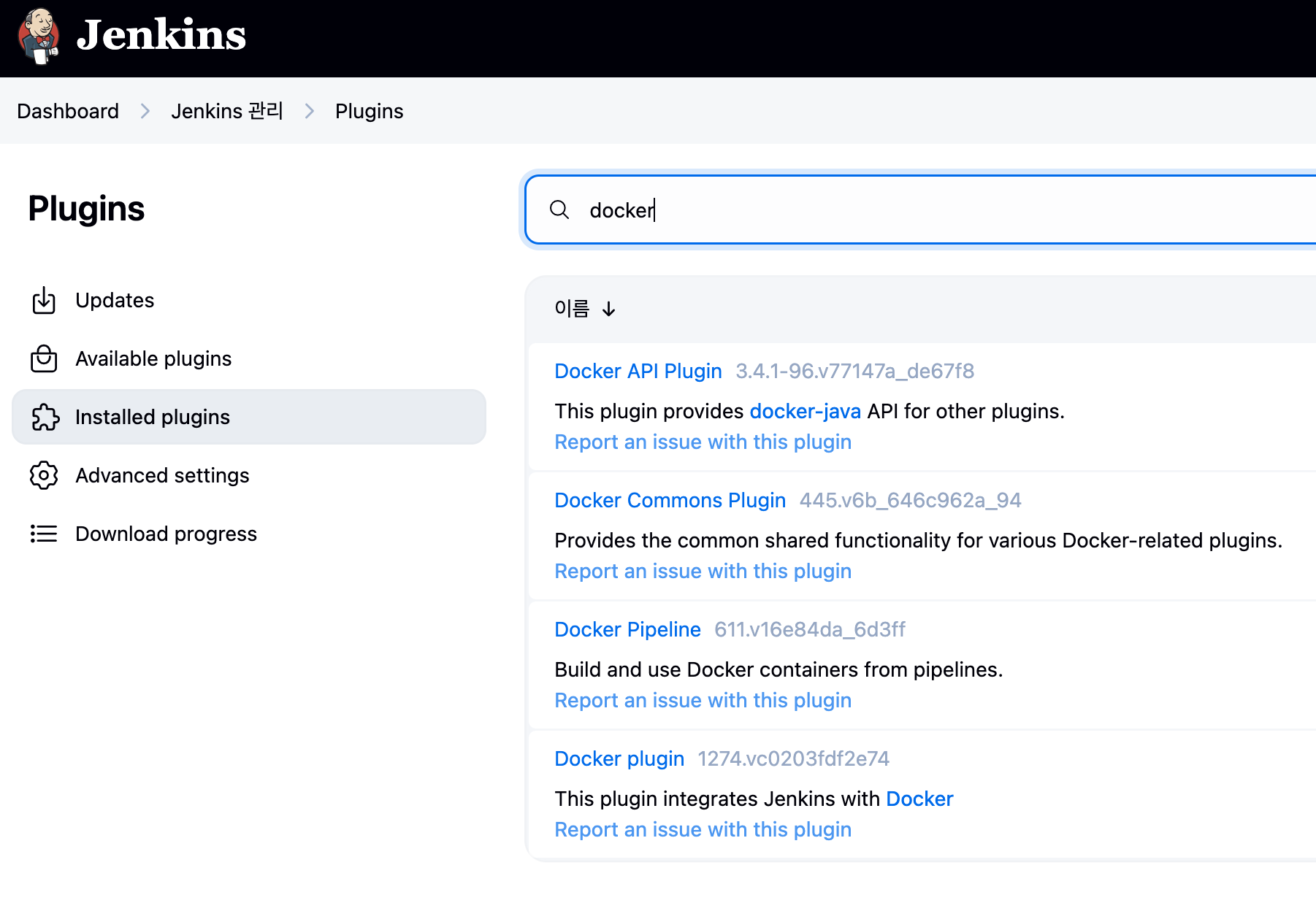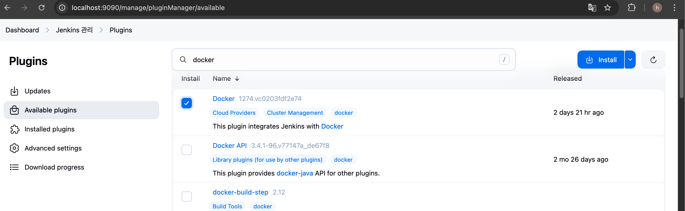 Docker Pipeline, Docker Commons Plugin가 필요하다. 그냥 전체 패키지인 docker 플러그인을 설치했다.