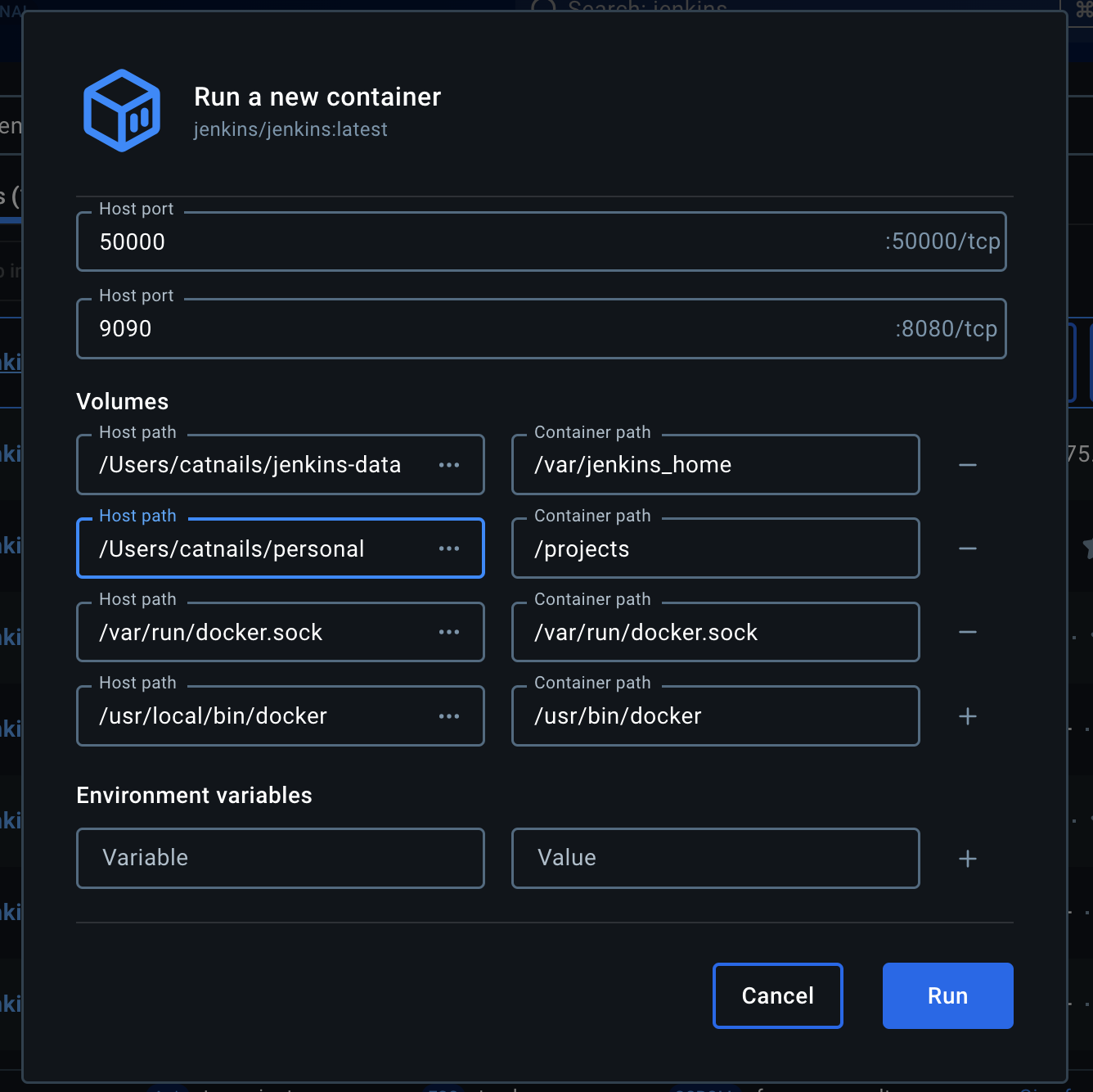 호스트의 프로젝트가 위치한 디렉토리를를 /projects라는 이름으로 연결해주었다. 이 방법을 통해서 젠킨스가 호스트의 프로젝트 디렉토리에서 작업을 수행할 수 있다. 만약 이렇게 해주지 않는다면 기존 프로젝트를 위에서 마운트한 jenkins-data 프로젝트로 옮기거나 링크를 걸어줘야 한다. 나는 그 방법이 번거롭다고 생각했기 때문에 이렇게 프로젝트들이 위치한 디렉토리를 마운트 해준 것이다.